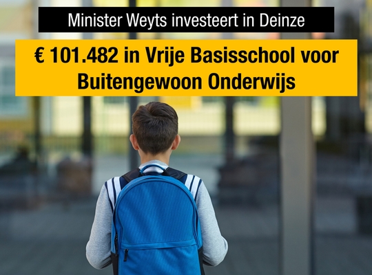 Vlaams minister van Onderwijs Ben Weyts (N-VA) investeert € 101.482 in Vrije Basisschool voor Buitengewoon Onderwijs in Deinze. “Een investering in scholenbouw is een investering in onze kinderen en dus in onze toekomst”, zegt Vlaams minister van Onderwijs Ben Weyts. “Goed uitgeruste klassen dragen immers bij aan de kwaliteit van ons onderwijs.”