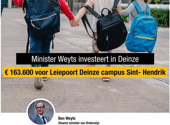 Vlaams minister van Onderwijs Ben Weyts (N-VA) investeert € 163.600 in Leiepoort Deinze campus Sint- Hendrik in Deinze. “Kwaliteitsvol onderwijs vraagt kwaliteitsvolle onderwijsinfrastructuur”, zegt Vlaams minister van Onderwijs Ben Weyts.